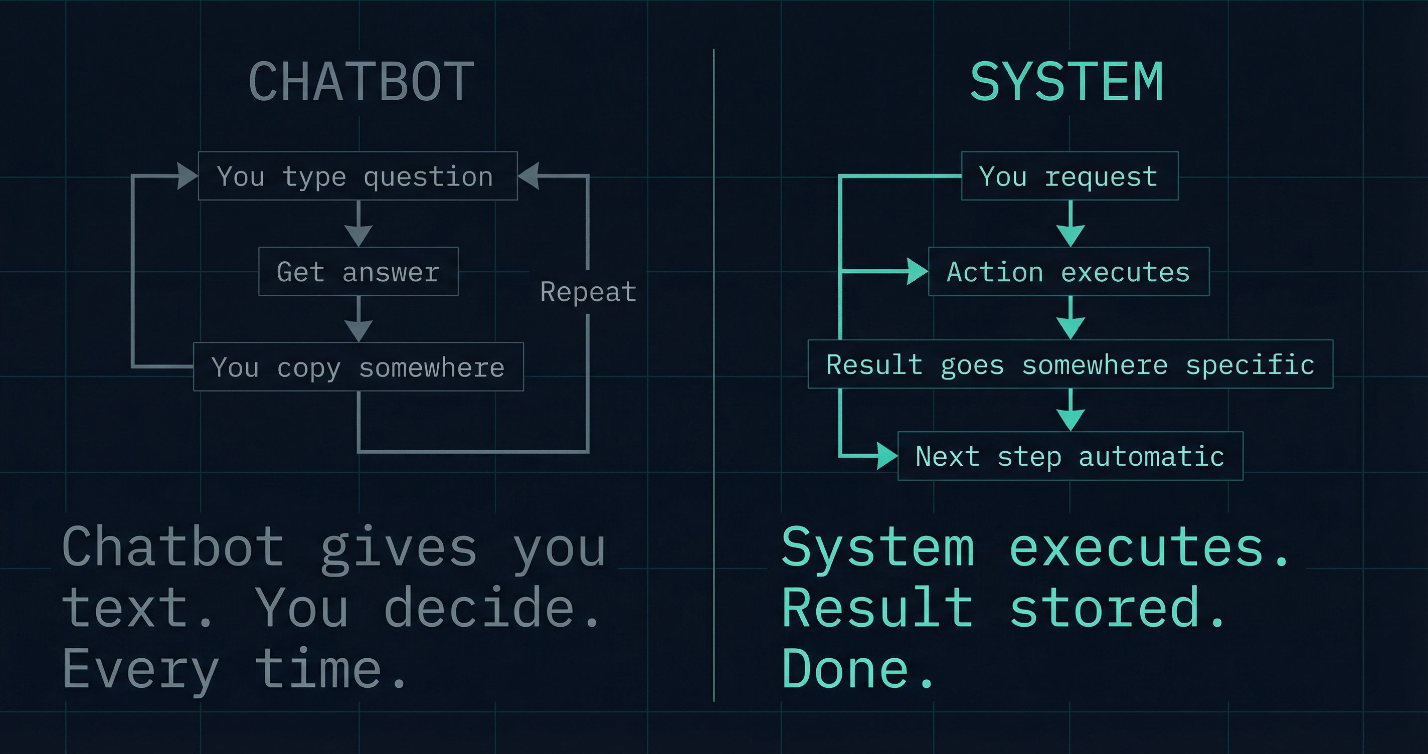 A chatbot gives you text. You decide what to do with it. Every time.